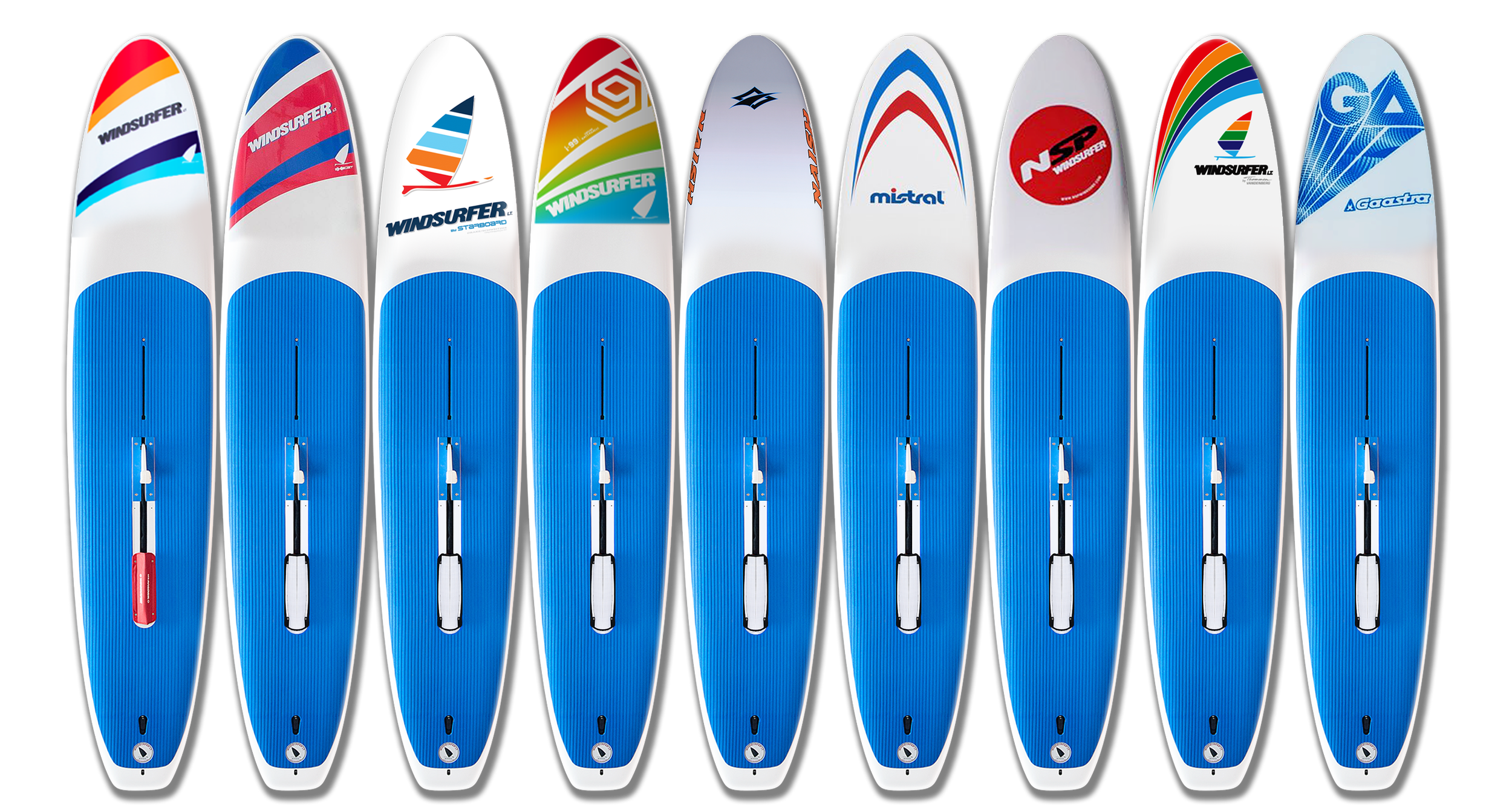 Pour stimuler une distribution la plus large possible, la Windsurfer LT est diffusée par 9 marques qui personnalisent le décor de la planche.